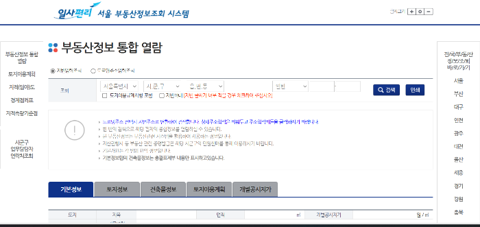 부동산 통합정보를 열람할 수 있는 사이트로 부동산 기본정보, 토지정보, 건축물정보, 토지이용계획, 개별공시지가를 한곳에서 조회할 수 있는 사이트입니다.