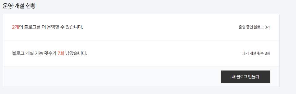그리고 티스토리 블로그의 경우 한계정 당 5개의 블로그를 생성할 수 있다고 합니다.  그래서 기본 블로그 외에 1개를 추가로 만들었습니다.