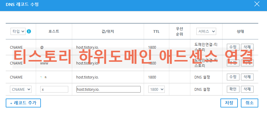 순서대로  타입 : CNAME 선택 - 호스트 : 자신이 원하는 도메인명(간단한 영문 숫자)  - 값/위치 : host.tistory.io. - TTL :1800 선택 후 확인 저장을 누르면 레코드 추가 작업이 완료됩니다.